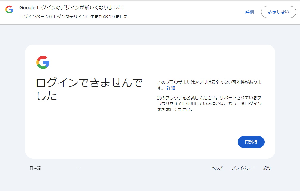 そうすると以下のような画面になってしまいログインができないといわれてしまう。