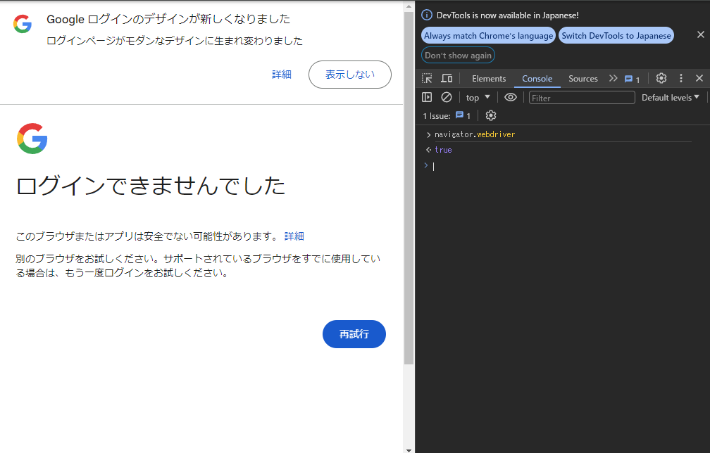 これについて調べてみると navigator.webdriver という値が true になっていることを判定して Google はログインできないようにしているらしい。